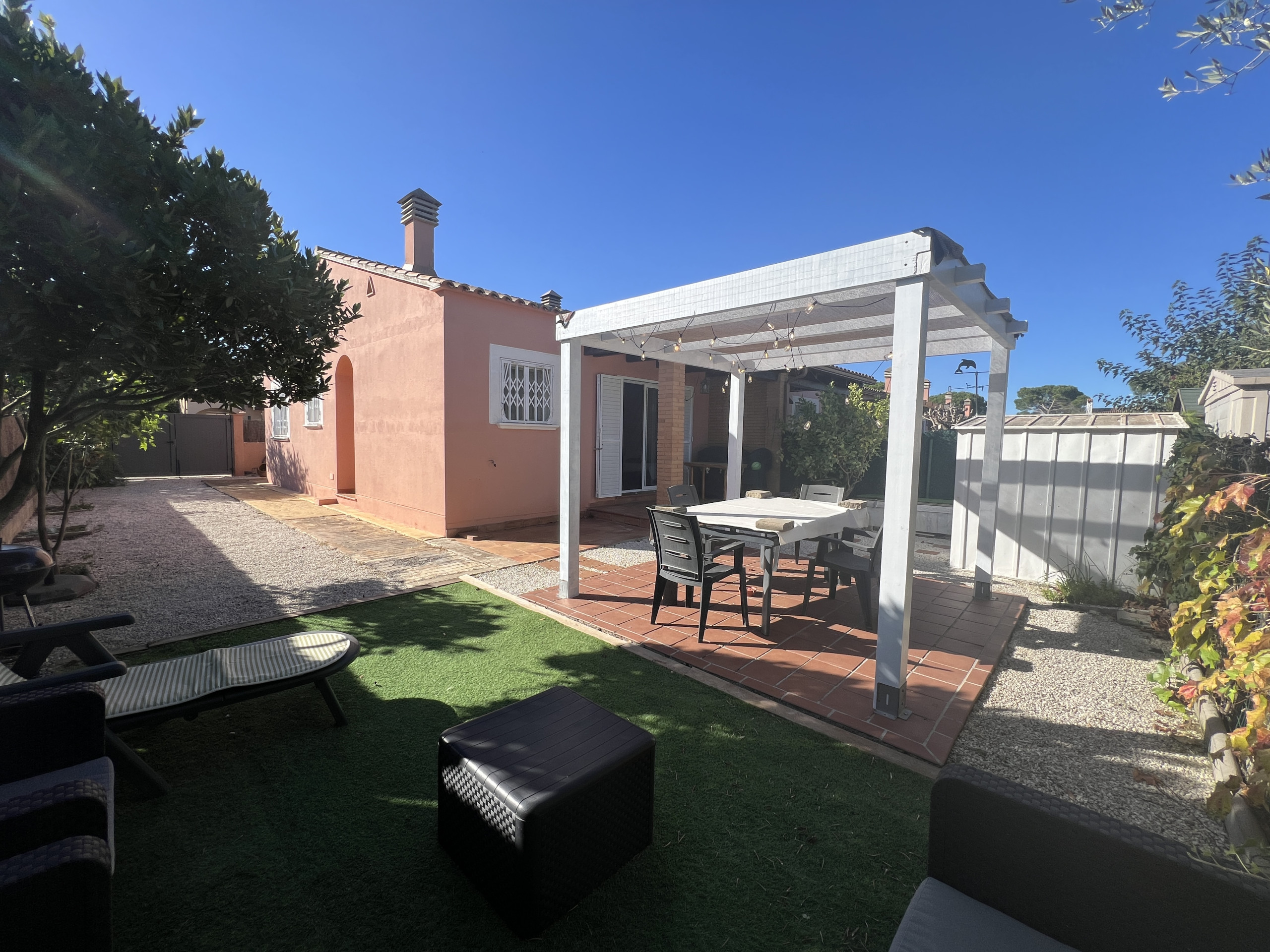 Entdecke dieses charmante Reiheneckhaus in der ruhigen Wohnanlage Mas Pinell! Mit einem großzügigen Garten, der das Grundstück umgibt, bietet diese Familienzuflucht einen idealen Raum zum Genießen im Freien. Das Haus verfügt über einen praktischen Eingang, der ein komplettes Badezimmer beinhaltet.